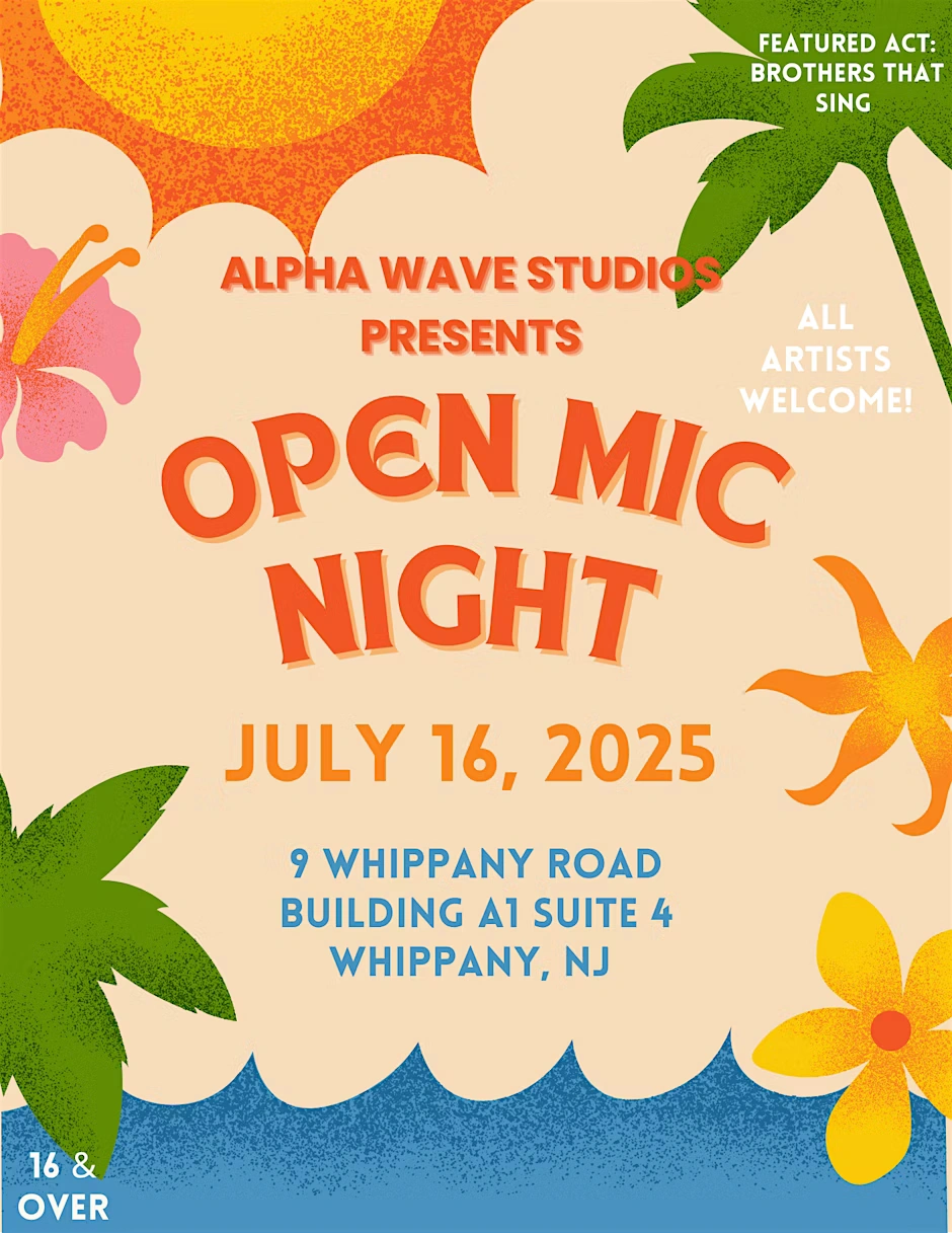 The exciting upcoming event, Open Mic Night at Alpha Wave Studios in Whippany, NJ, is a recurring showcase held on the 3rd Wednesday of every month, offering a platform for local musicians, comedians, poets, and performers of all genres to share their talents, connect with fellow creatives, and enjoy a vibrant evening of live entertainment.