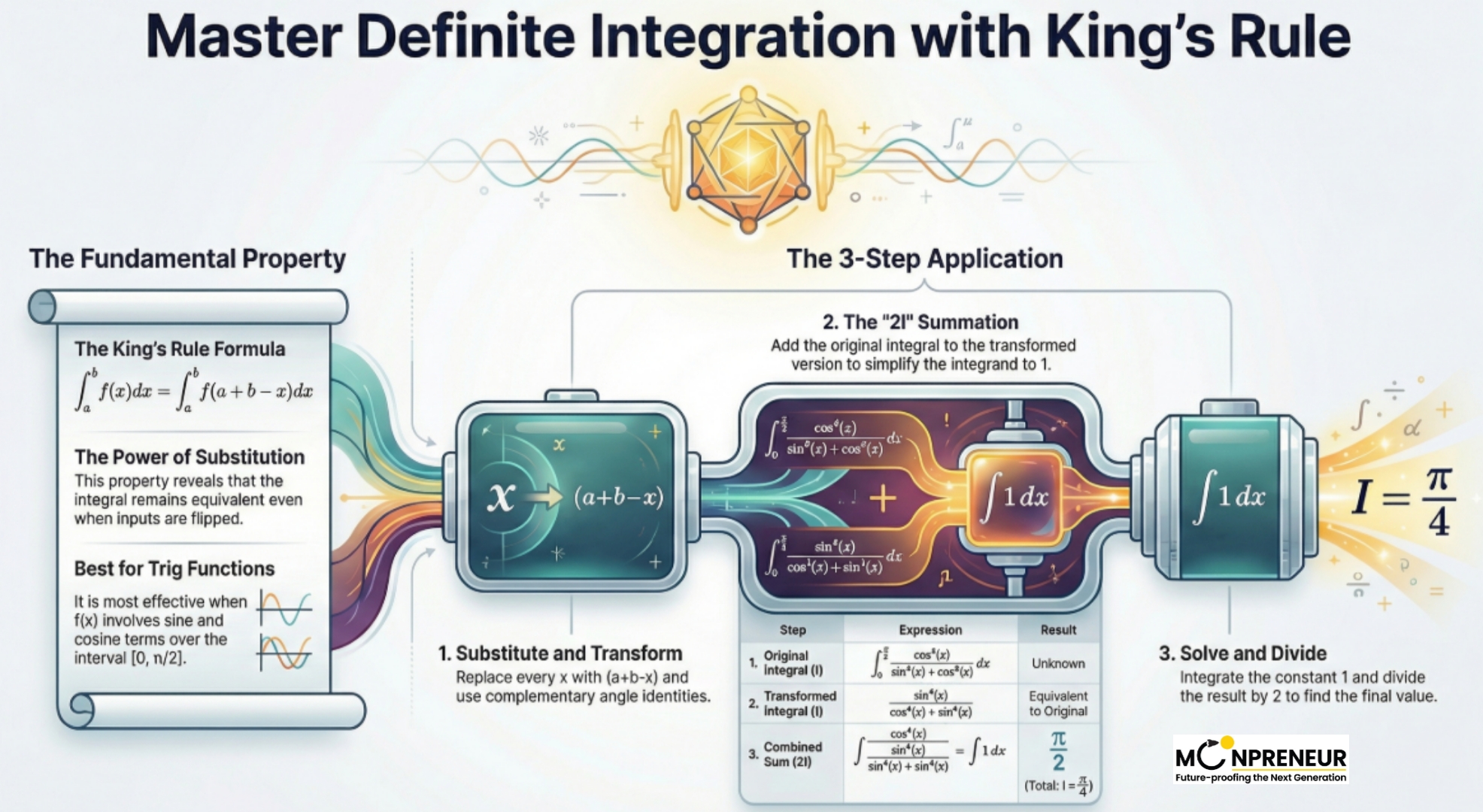 At its heart, King’s Rule is a property of definite integrals that allows you to swap the variable in a way that often simplifies the entire expression. It replaces the variable x with a+b-x (sum of limits minus x)