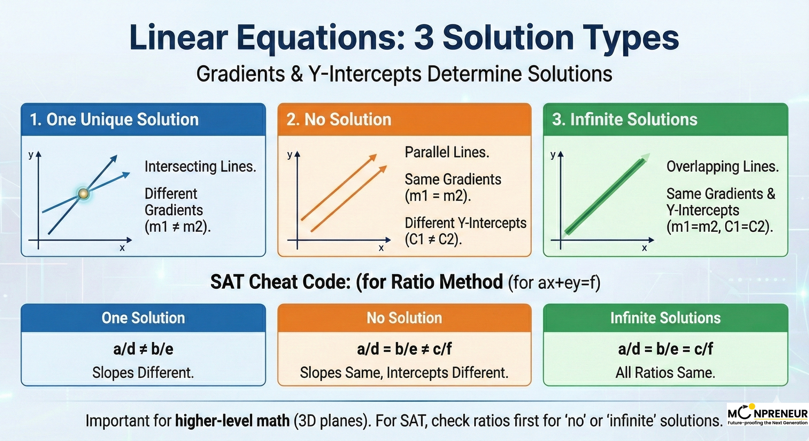 When you’re under the clock during the SAT, you don’t always have time to draw a graph. The sources suggest a much faster way to check these conditions using the coefficients of the equations (when written as ax + by = c and dx + ey = f )