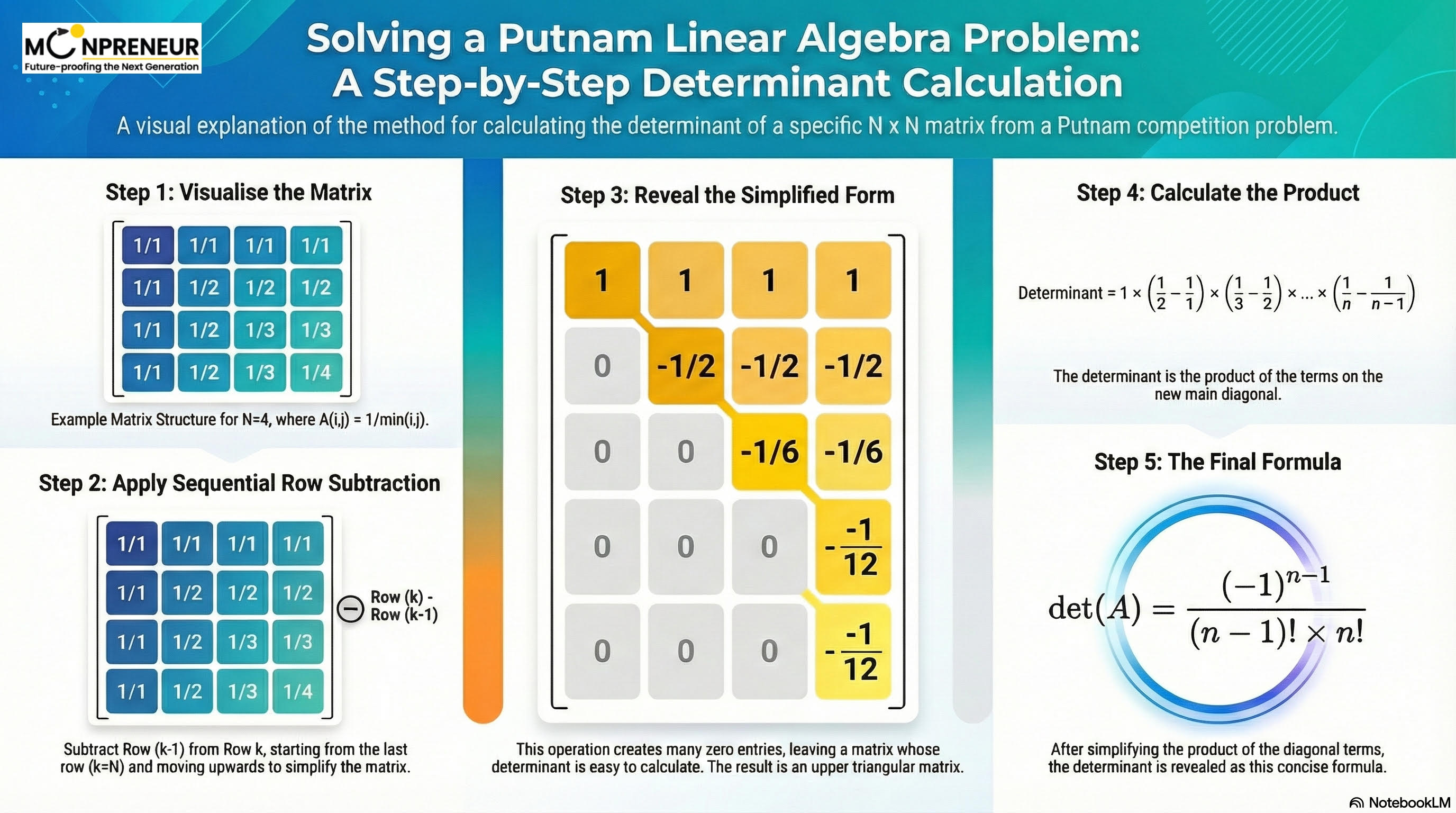 Today, I want to break down a legendary problem from the Putnam Linear Algebra. While Putnam is known for being incredibly tough, the logic behind this specific determinant problem is actually a fantastic lesson in pattern recognition—a skill that is gold for the SAT Math section.If you’re interested in the tech of the future, understanding how these “grids of numbers” work is your first step.