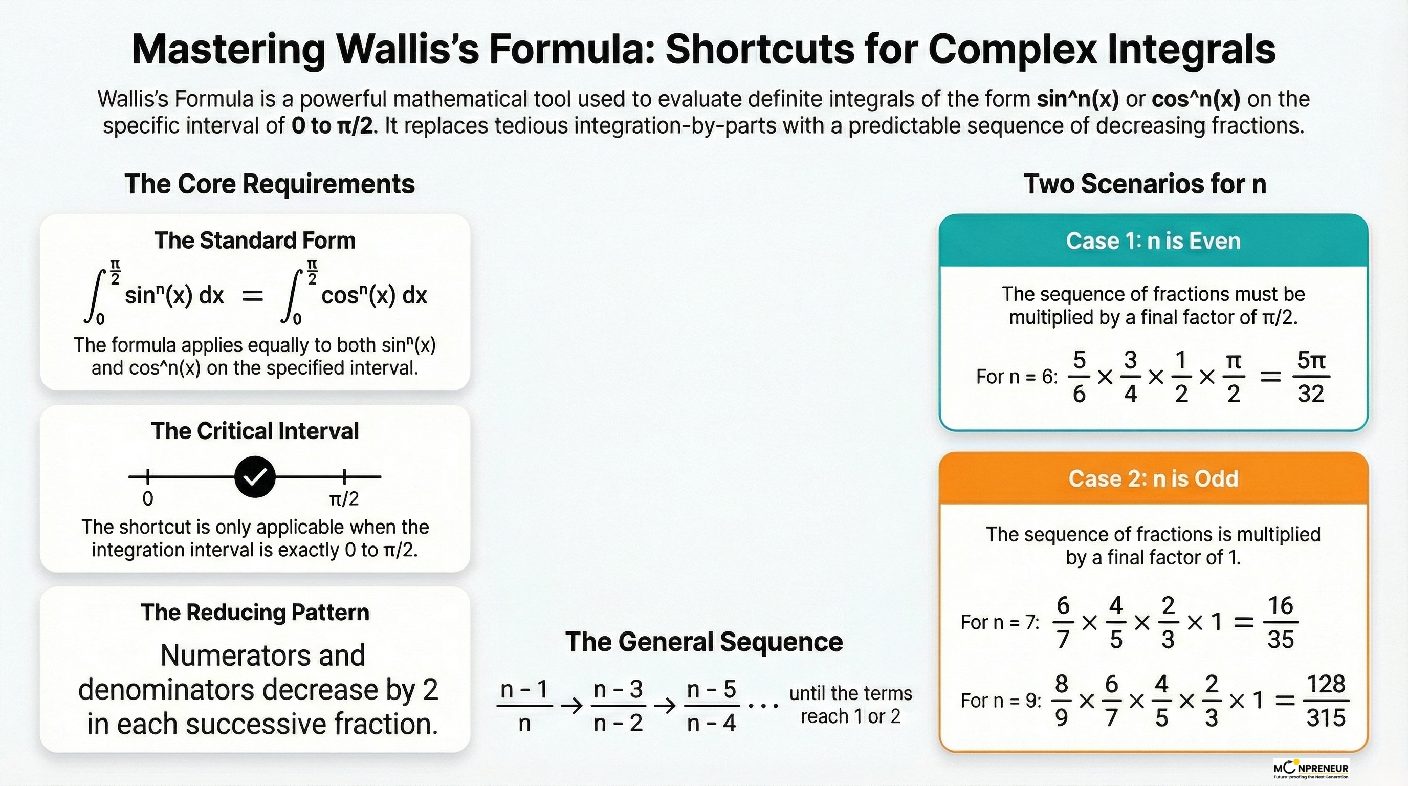 Before we dive into the math, there is one non-negotiable rule. The Wallis Formula only works if your integration interval is from 0 to π/2. If you see those limits and a power of sine or cosine, you’re ready to use the hack.